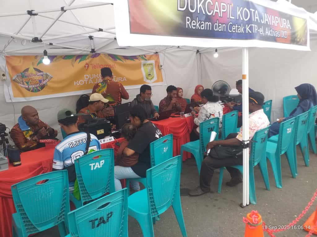 Kota Jayapura – Dukcapil. Dinas Kependudukan dan Pencatatan Sipil Kota Jayapura bekerjasama dengan Dinas Perindustrian, Perdagangan, Koperasi dan Usaha Kecil Menegah Kota Jaypaura, membuka pelayanan administrasi kependudukan bagi warga masyarakat kota Jayapura pada even Festival UMKM yang digelar di Terminal Tipe A Entrop Kota Jayapura. Festival bertajuk “September Ceria, UMKM Berani Eksport” ini telah berlangsung sejak Kamis (18/9/2025) dan akan berakhir pada SabTu (20/9/2025).